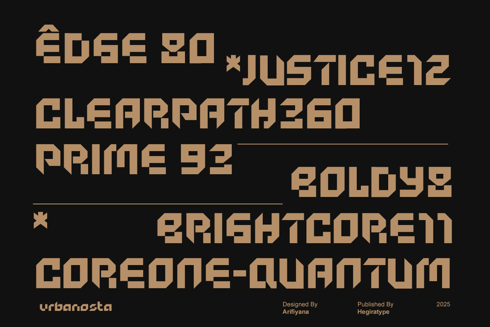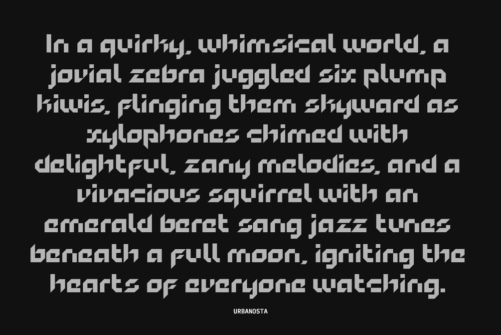 Designed as a futuristic display typeface, Urbanosta blends geometric foundations and seamless transitions, creating a visual rhythm that's both striking and incredibly versatile. Every detail has been carefully considered to balance experimental aesthetics with functional clarity, ensuring that this typeface not only captures attention but also maintains excellent legibility across a variety of media.